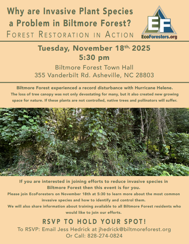 The Reforest The Forest speaker series, hosted by the town’s tree committee, begins Tuesday, November 18th at 5:30pm in Town Hall. EcoForesters will be addressing the topic of why invasive species are a problem in Biltmore Forest, what they have been doing to mitigate the problem on town property, and how important it is for residents to join in the efforts. Make sure you mark your calendars and join us in learning more about non-native species and what you can do to help! Please visit biltmoreforest.org for more information.