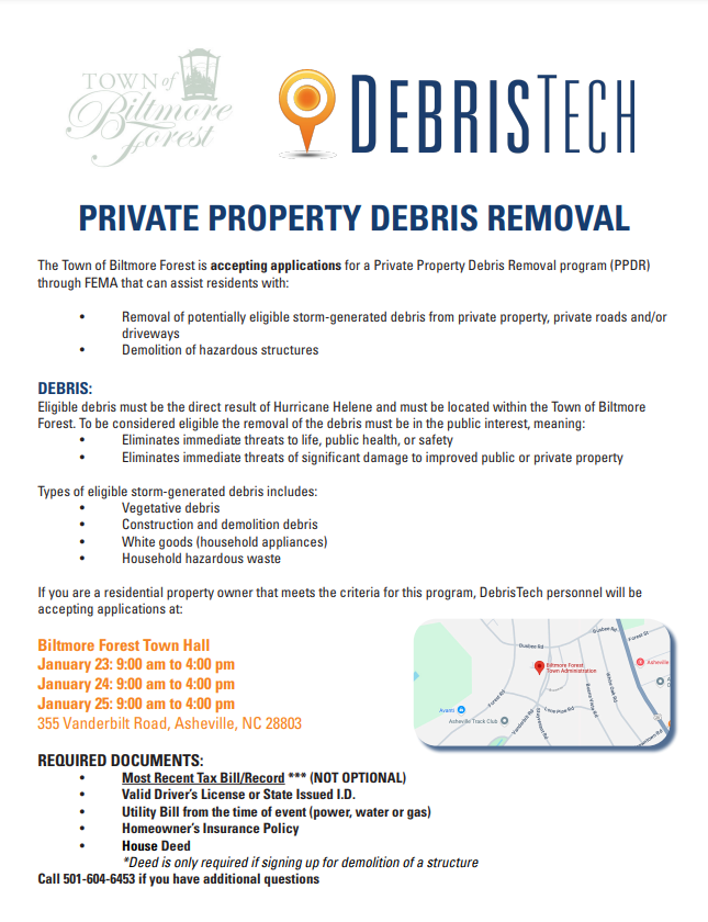 The debris removal program and reimbursement process through FEMA involves various levels of work. The first is debris removal from the public rights of way. The Town has removed just over 286,000 cubic yards form the public right of way since beginning work on October 12, 2024. As we near the completion of the “first pass” of this work, the Town is now able to move forward with the next levels of debris removal. This will include removal within public properties like parks and also the potential for debris removal from private property and waterways. The private property debris removal (PPDR) program is the most directly impactful for residents and will be explained in the attached document below.