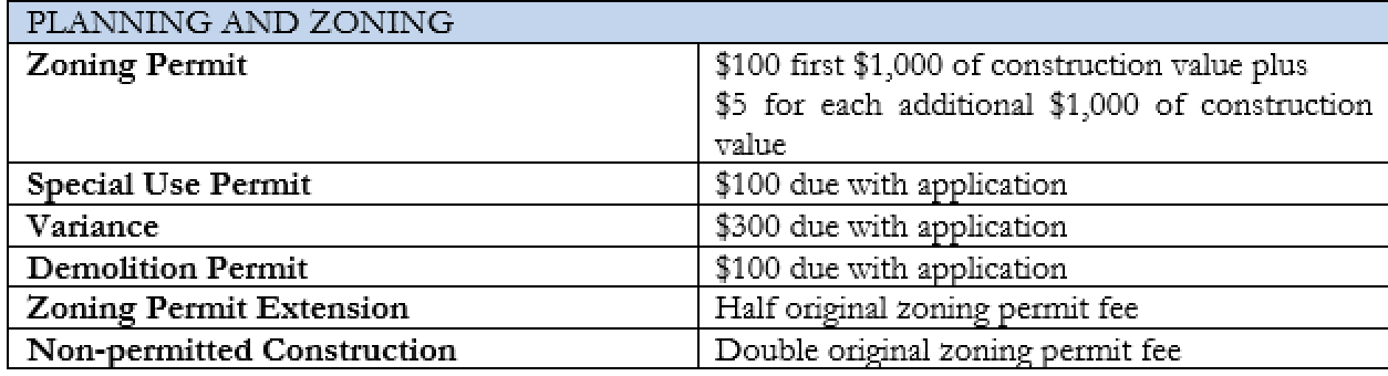 Certificate fees are based on the value of construction and must be paid when picking up the Certificate of Zoning Compliance. The Board of Commissioners review and amend the fee schedule on an annual basis. The current FY26 fee planning and zoning fee schedule may be found below.